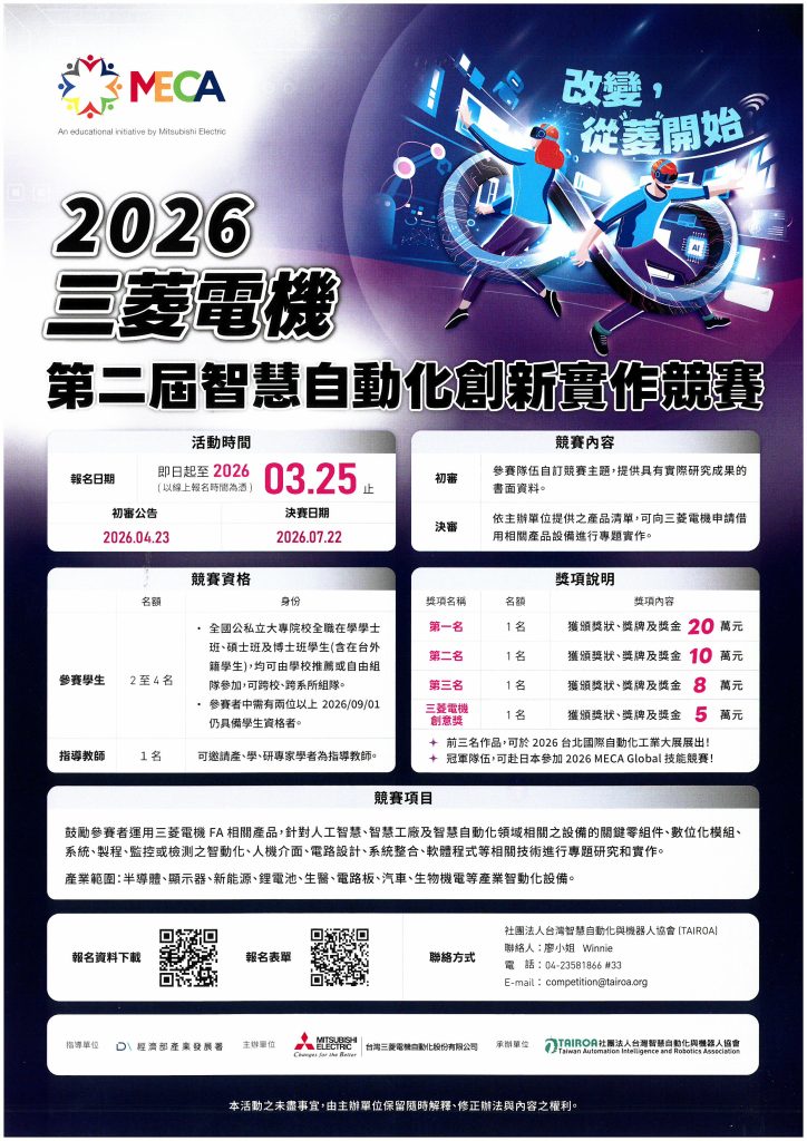 台灣三菱電機自動化股份有限公司於 2026 年舉辦第二屆三菱電機智慧自動化設備創新實作競賽( Mission、Experience、Communication、Achievement , MECA ),鼓勵國內大專院校學生運用三菱電機FA相關產品,投入智慧自動化跨領域設備的實作與創意發想,並經由競賽促進學生吸收新知、技術交流及產學合作,期許藉由串聯學術界與產業界,協助更多人才投入智慧製造領域的創新實作,提升產業競爭力。
