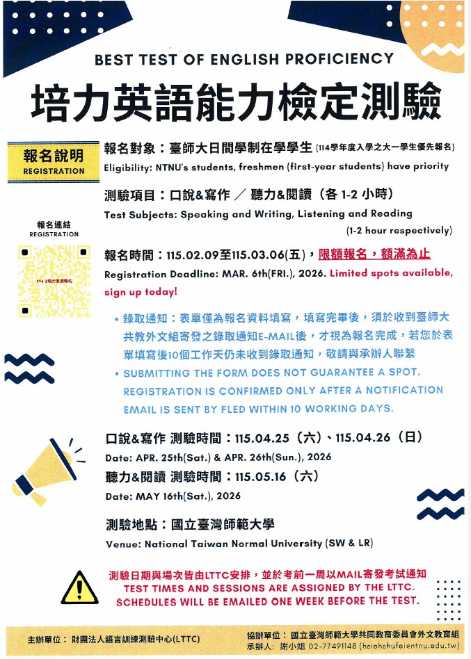 【活動轉知】培力英語能力檢定測驗 歡迎踴躍報考!◈主辦單位:財團法人語言測驗訓練中心(LTTC)◈協辦單位:國立臺灣師範大學共同教育委員會外文教育組測驗目的:培力英語能力檢定測驗(BESTEP)主要目的為評量大專校院學生英語文能力及回饋英語教學,了解學生經過學校英語課程輔導後的英語文能力發展、協助學生在修習EMI課程前了解自己的英語文能力與掌握學生銜接進入EMI課程的先備英語文能力等。測驗費用:本次測驗項目包括聽、說、讀、寫四項完整測驗,報名與考試皆免費!報名時間:115年2月9日(星期一)至3月6日(星期五)16:00 止 。報名表單連結:https://forms.gle/MpERSQ6nFckje8qd7 更多資訊請點進入 Post author:ciai Post published:2026-02-23