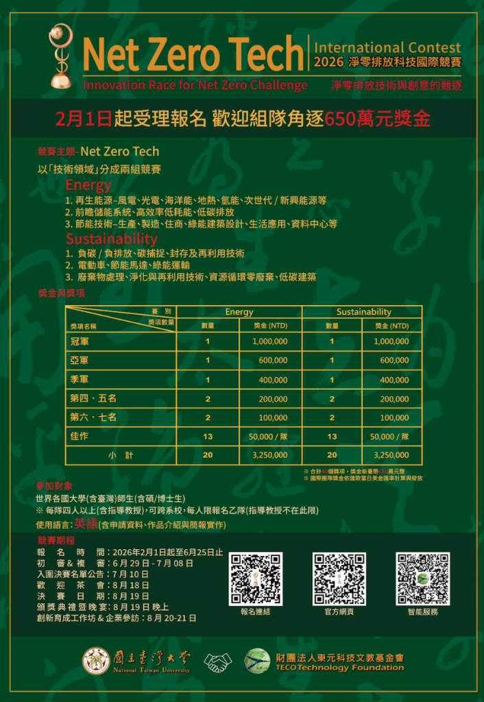 財團法人東元科技文教基金會與國立臺灣大學共同主辦「2026淨零排放科技國際競賽」,旨在人才培育、建構產學合作平台、促進全球淨零技術之交流,並且以下列方式為台灣的人才培育與科技教育研究創新成果,建立國際聲望與專業影響力,歡迎世界各國大學(含臺灣)師生(含碩/博士生)。 每隊四人以上(含指導教授),可跨系校,每人限報名乙隊(指導教授不在此限)。